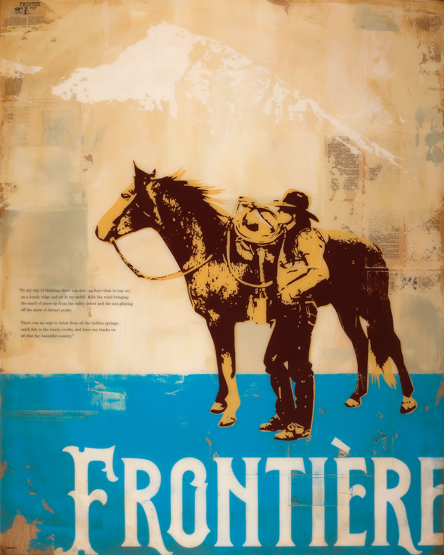 She appreciates the complexity of his work, the layers, and the connotations that his work brings to mind. "His background in advertising and film are so important in his art," Collins says. "It informs his work in an authentic way, and it gives his work substance. Last year he did a series based on Louis L'Amour books … he managed to capture the romance and grit of the American West."