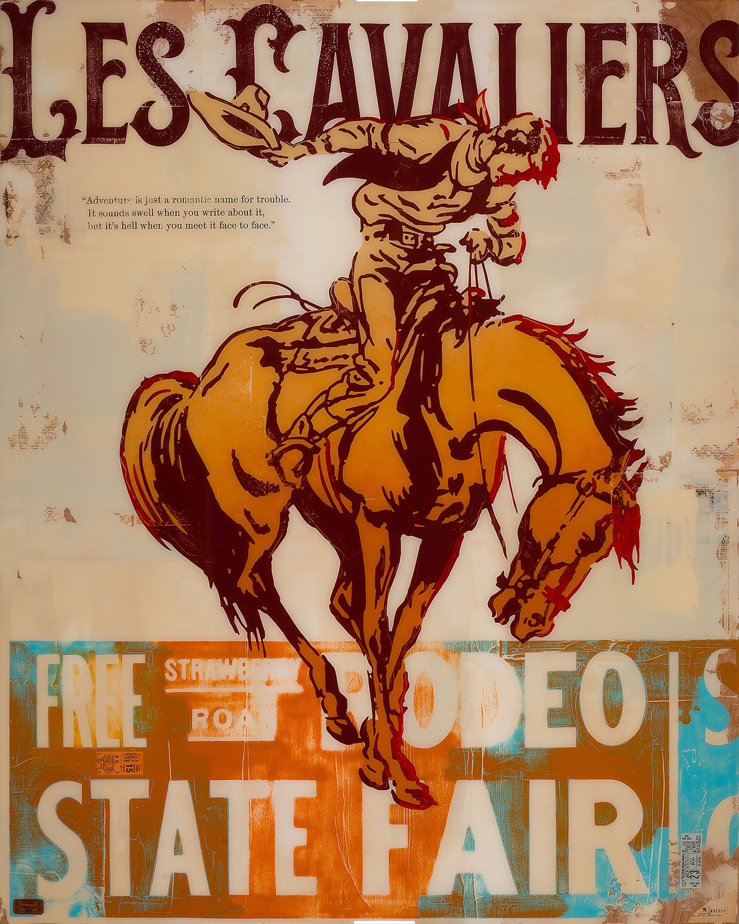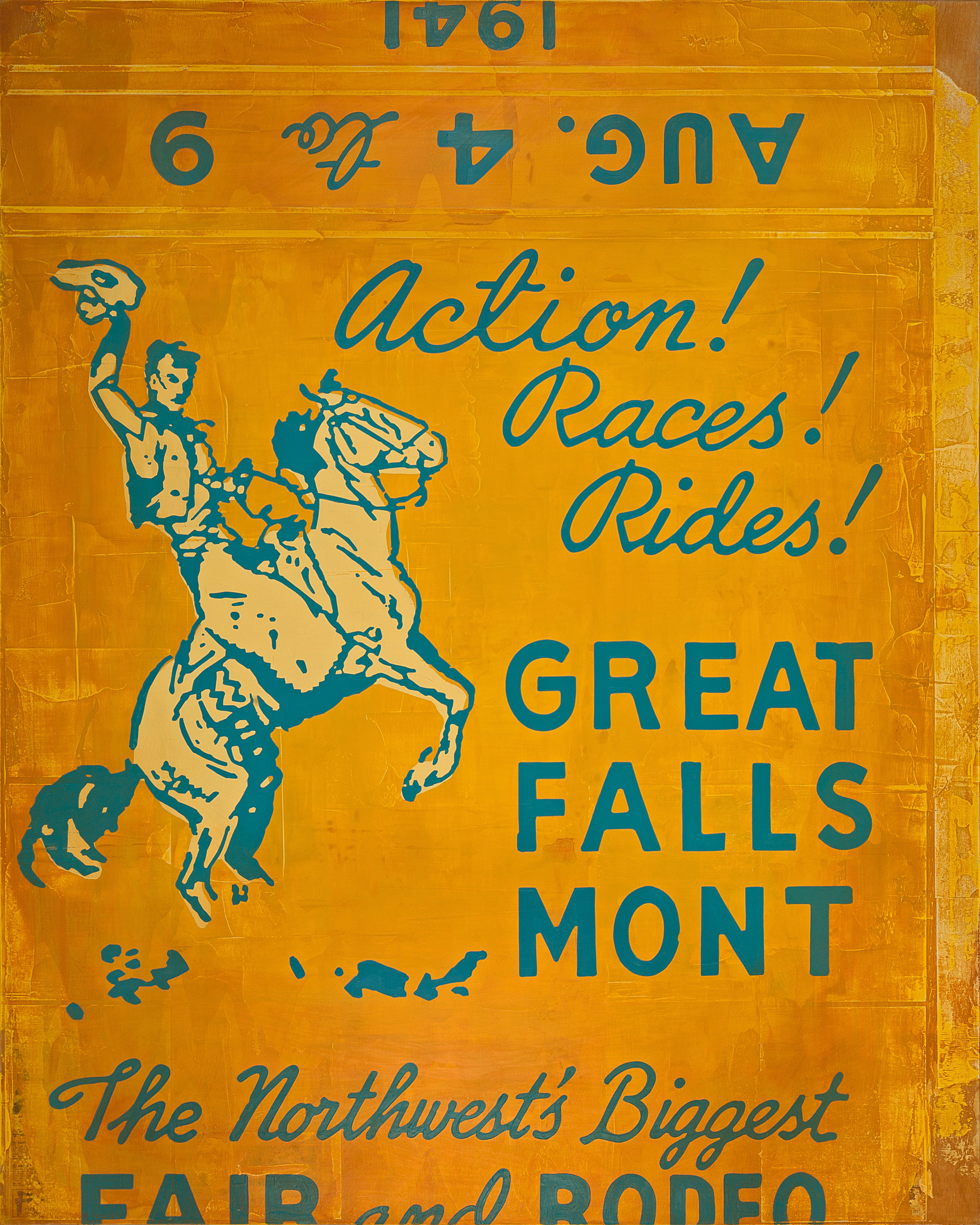 Many of the paintings are Montana-based, like One Strike, One Ride, inspired by a matchbook from the 1941 Great Falls Rodeo. The magic of Bedow's works are the treasures beneath the paint. In this one there are advertisements from an old newspaper. The result is like stepping into a time warp. Of course, the painting is exponentially larger than an actual matchbook, but the color and the authenticity of imagery is transportive.