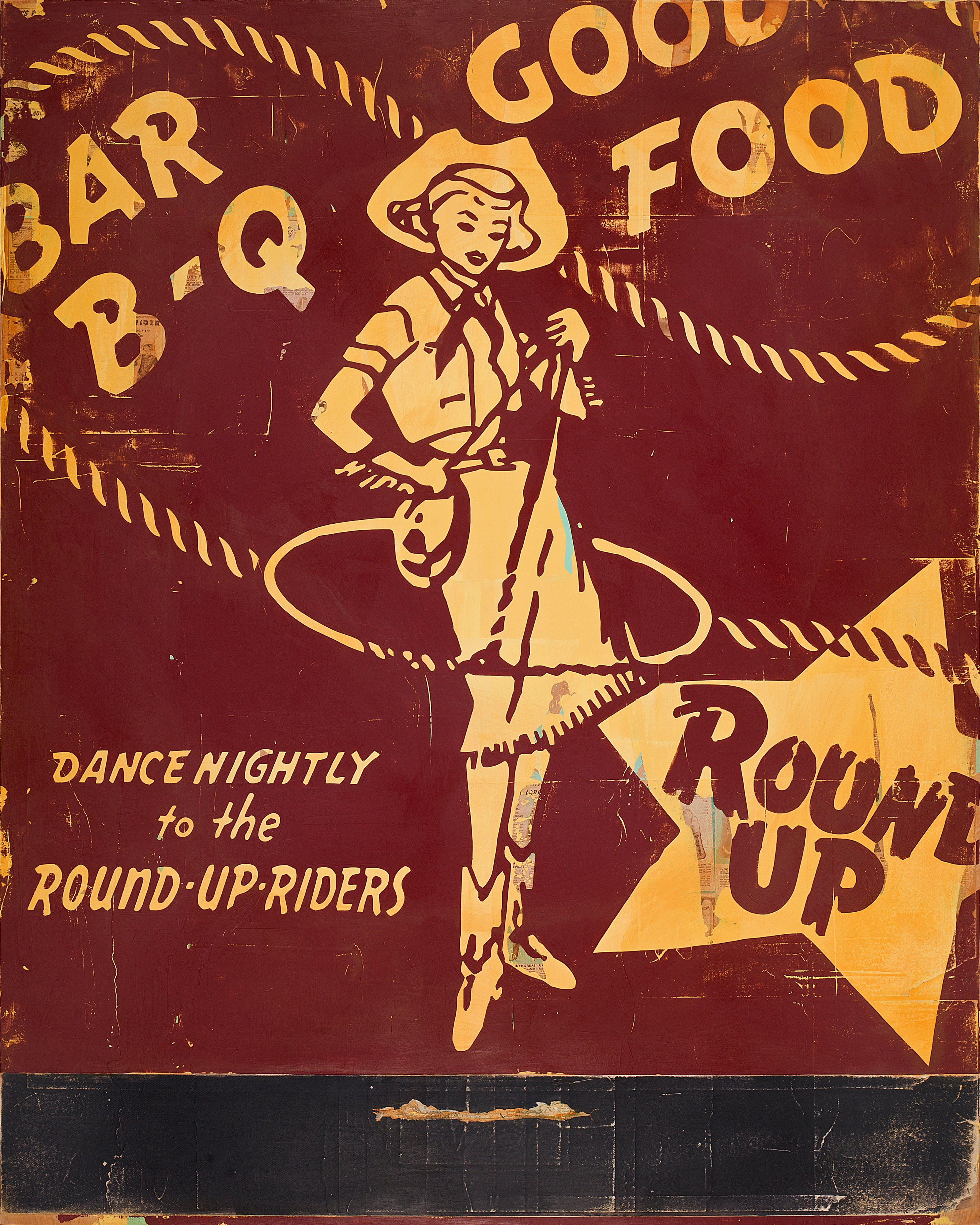 However, when looking at a Bredow piece, don't stop looking after the initial impression. There is so much more to the work. There might be old pages from newspapers underneath the first coat of paint, peeking through the colors. There might be a quote, or a title, an ad for Western Saddle, or old Daisy BB gun targets, hinting at the underlying impetus for the painting. There's always a little bit more to discover.