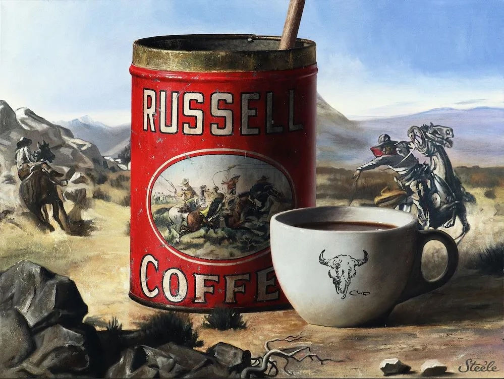 The coffee still life is set within a Charlie Russell action scene. Steele gives a nod to this famous early Western artist who often depicted cowboys on the trail. And they needed lots of coffee! Notice the painting’s small details: the can’s scratched label and textured metal rim, highlights on the surface of the coffee. When a painter masters realism like Steele, it is common to digest the work as a whole but possibly miss subtle touches that truly bring the painting to life. He makes the finished product look effortless. Steele also added a cow skull on the cup as a nod to Russell, who drew the same image next to his painting signatures.